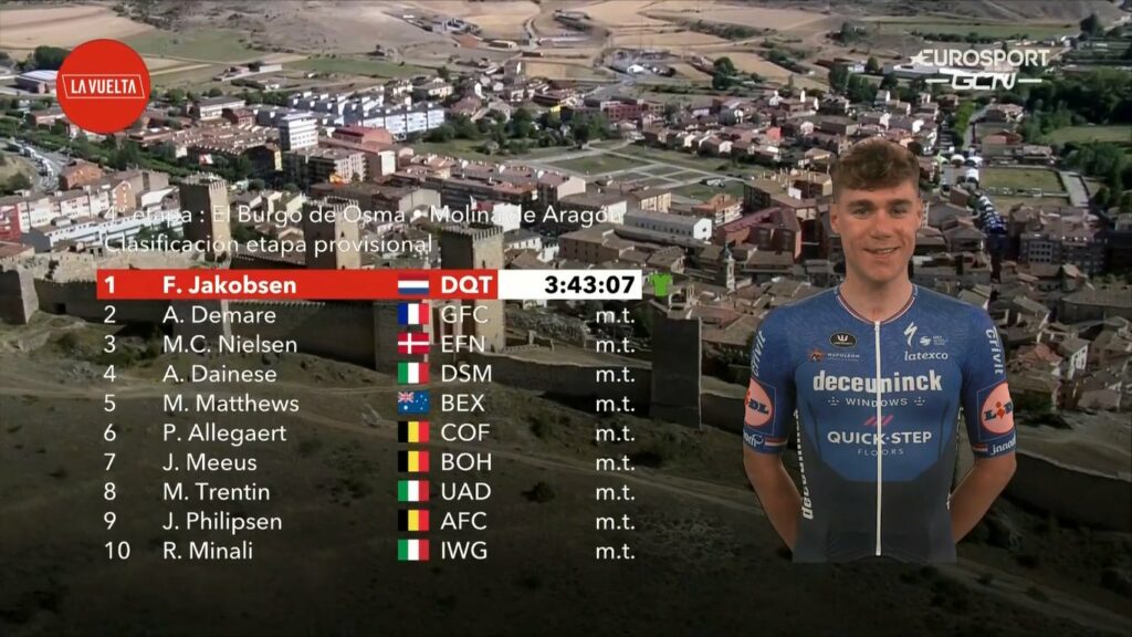 La distancia de la etapa fue de 163,9 km. entre las localidades de El Burgo de Osma – Molina de Aragón. Jakobsen lideró con un tiempo de 3 horas, 43 minutos y 7 segundos. El mejor sudamericano ubicado, fue el colombiano Juan Sebastián Molano, en el puesto 18, seguido de los también ‘neogranadinos’ Miguel Ángel López (21) y Egan Bernal (22).