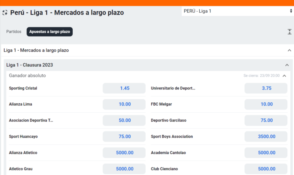 Para analizar con objetividad las posibilidades de los 19 equipos participantes en la Liga 1 2023, vamos a mirar las cuotas que se ofrecen en Betano Perú. Esta sólida casa de apuestas se vale de estadísticas y pronósticos de expertos para ofrecer sus momios, lo que nos da una pista de qué clubes tienen más probabilidad de levantar la Copa esta temporada.
