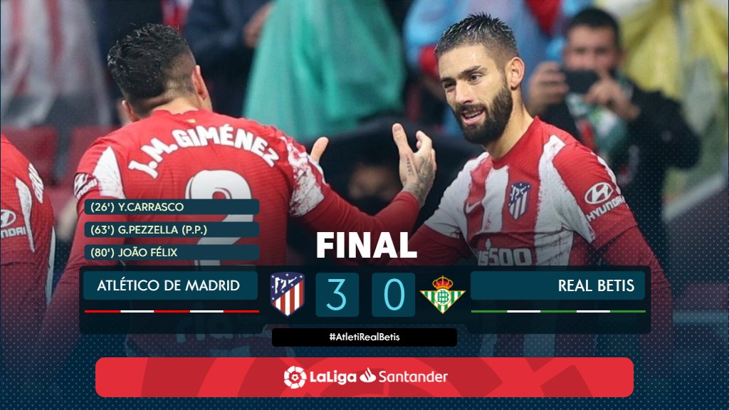 Las anotaciones que hicieron posible que el ‘Colchonero’ propinara su primera goleada de la temporada, fueron obra de Yannick Ferreira-Carrasco (26’), Germán Pezzella, en contra, (63’) y Joao Félix (80’). De esta manera, se vuelven a meter en la pelea por el título liguero, tras 12 jornadas disputadas de forma oficial.