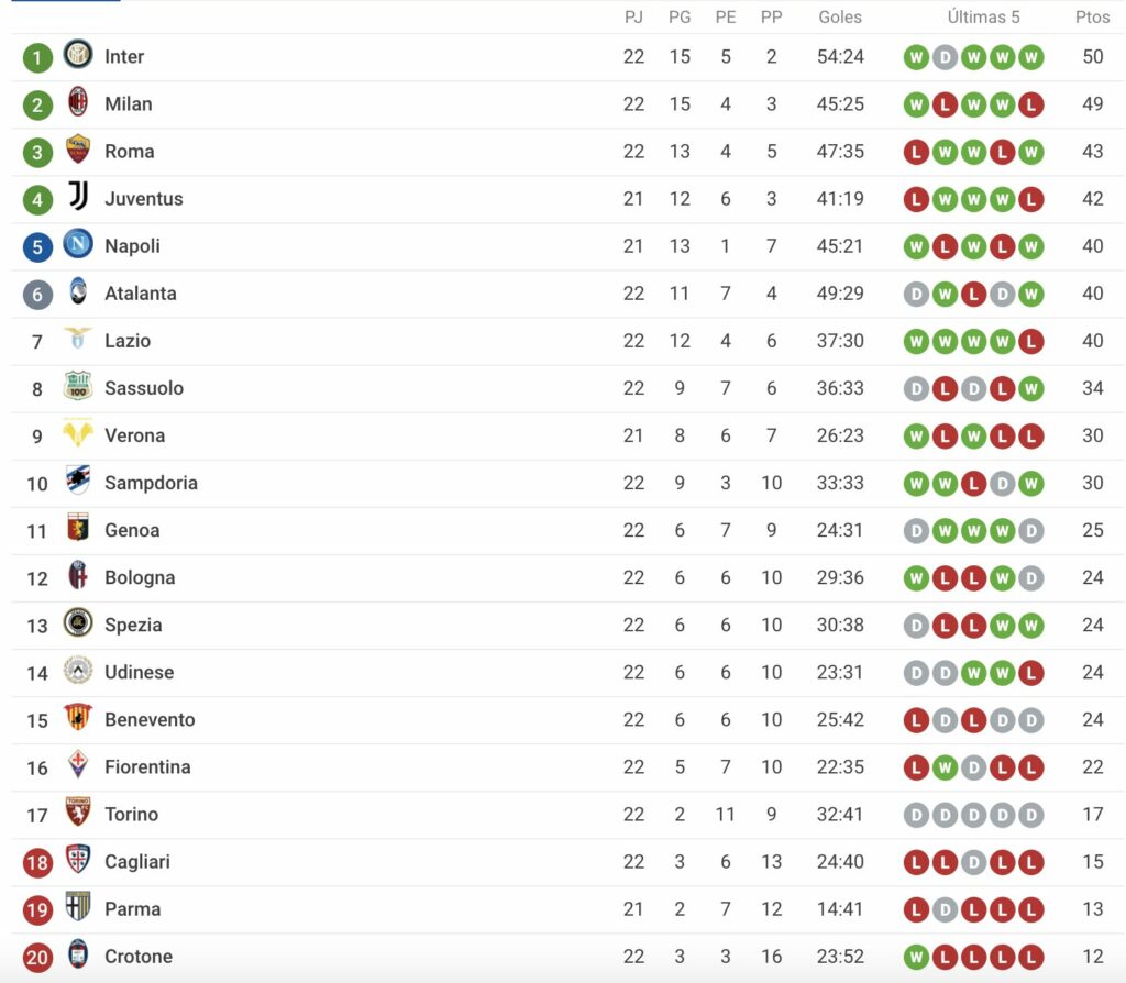 El Inter de Milán, alcanza los 50 puntos en el torneo, superando al Milan, que es segundo, por una unidad. En la tercera casilla está la Roma con 43. Mientras que el cuarto y quinto puesto, pertenece a Juventus y Napoli, con 42 y 40 unidades, respectivamente, teniendo ambos un partido pendiente.