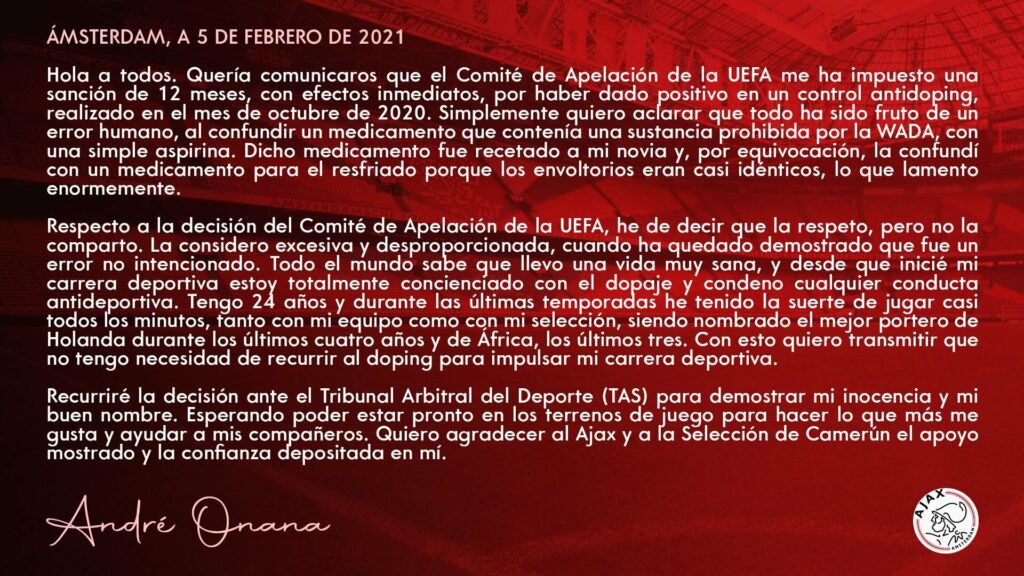 La confusión de Onana hizo que se tomara por error el medicamento de su esposa, lo que finalmente provocó que la UEFA tomara esta medida contra el portero. Además, el órgano disciplinario de la asociación de fútbol ha manifestado que Onana no tenía intención de hacer trampa.