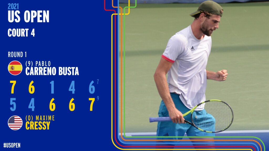 Desde temprano empiezan a hacerse presentes las sorpresas en el US Open 2021. En el segundo día de actividad formal del evento neoyorquino este martes, se pudo observar la derrota y eliminación de uno de los 10 pre-clasificados. Haciendo su debut en el torneo, la raqueta española Pablo Carreño Busta, noveno favorito, sucumbió ante el tenista local Maxime Cressy, suponiendo el primer batacazo del certamen, en cinco parciales por marcador de 5-7, 4-6, 6-1, 6-4 y 7-6(7).