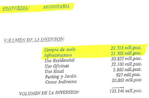 Pero en medio de este tumulto, surgió un caso singular. Un caso que desconcertó a muchos y que, a día de hoy, sigue siendo un misterio. En julio de 1994, se firmó el contrato de adjudicación con el Banco público Argentaria (posteriormente fusionada con BBV), la única oferta que incluía una partida de inversión destinada a la compra del suelo, por importe superior a la destinada para la inversión en infraestructuras y la única oferta que se hacía cargo y asumía todos los costes y gestiones relacionados con las compensaciones a los reversionistas.