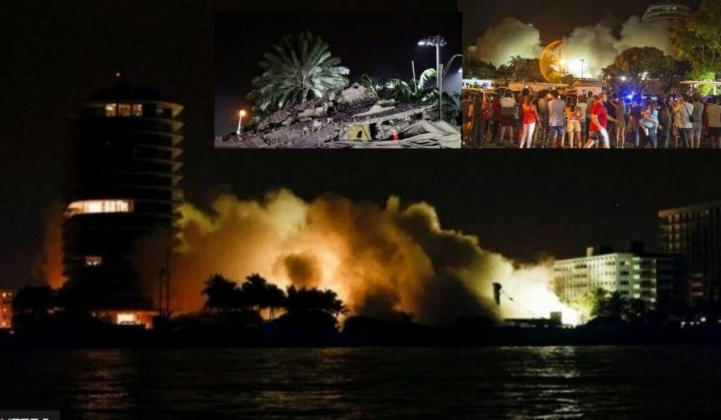 Exactamente a las 22:30 hora local fue derribado por completo el edificio que dejo decenas de muertos y muchos desparecidos. Varios explosivos pequeños fueron colocados por expertos las bases del edificio Champlain Towers, para demolerlo por completo en la noche del 4 de julio. Las razones para demoler este edificio en Miami fue derivado a la tormenta tropical Elsa al sur de Florida.