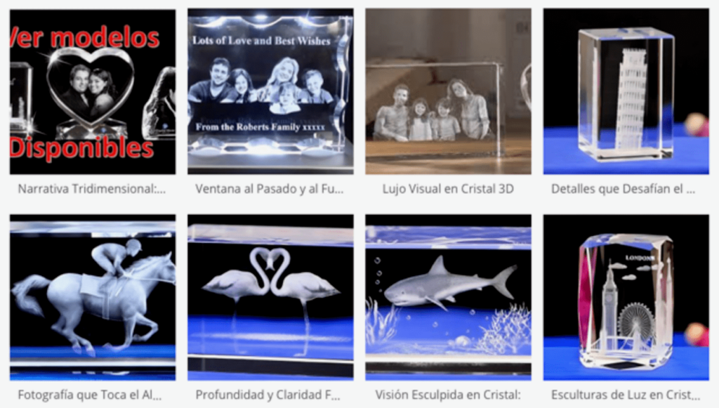 Las fotos en cristal 3D son una forma innovadora de capturar recuerdos y convertirlos en una obra de arte tridimensional. Utilizando tecnología láser, las imágenes se graban con una precisión impresionante, lo que permite resaltar cada detalle y crear un efecto de profundidad único. Este tipo de grabado añade una dimensión adicional a la imagen, transformando una simple fotografía en una pieza visualmente impactante. Las personas que reciben este tipo de regalo quedan impresionadas por el realismo y la claridad de la imagen, lo que convierte a las fotos en cristal 3D en una opción ideal para cualquier tipo de celebración.