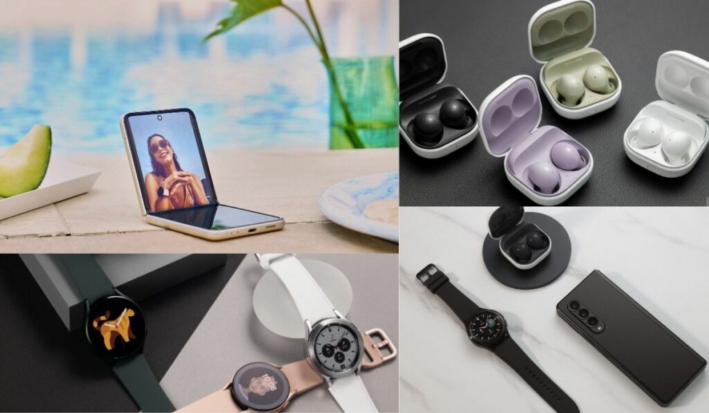 Catalogo tecnológico de Samsung con teléfonos plegables y relojes