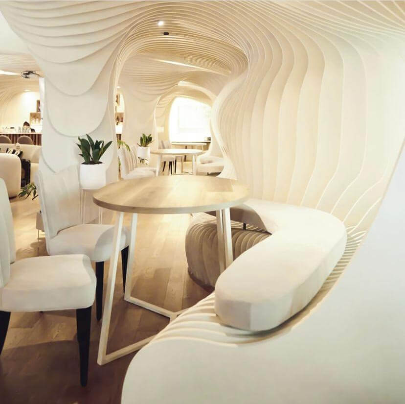 Mudra es un término en sánscrito que significa signo, gesto, ritual. El restaurante Mudra del barrio de Almagro es un ritual para los veganos y vegtarianos. Apenas entramos, nos llama la atención su original decoración, donde no hay puntas ni líneas geométricas. Las paredes son blancas y ondulantes simulando cavernas, con muebles modernos en tonos grises y blancos.